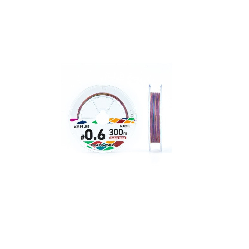 Tailwalk PeeWee WX4 Multicolor Braid Description The Tailwalk PeeWee WX4 Marked is a high-quality, 4-strand, multicolored braid made of "Ultra Dyneema," designed and manufactured in Japan for freshwater and saltwater fishing.